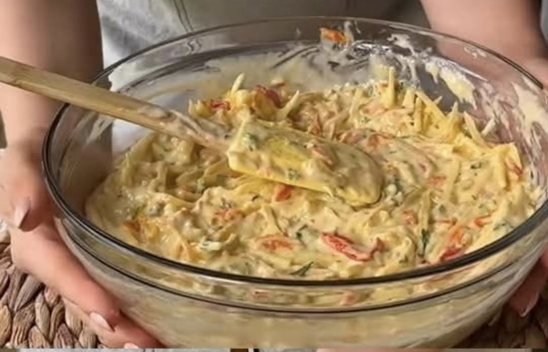 U sledećem koraku, dodajte narezanu papriku u tiganj i sve zajedno dinstajte dok povrće ne omekša i ne pusti svoje arome. U međuvremenu, u zasebnoj posudi umutite tri jaja, a zatim ih pomešajte sa solju, biberom, čašom mleka, brašnom i praškom za pecivo. Mikserom sjedinite sve sastojke dok ne dobijete glatku smesu. Zatim dodajte prethodno pripremljeno povrće u smesu i pažljivo promešajte. Ova smesa bi trebala biti dovoljno gusti da se može oblikovati, ali i dovoljno tečna da se ravnomerno rasporedi po plehu.